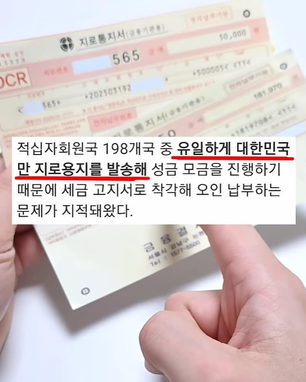 「赤十字の加盟国198カ国のうち、韓国だけが振込納付書を発行し、寄付を募っている。